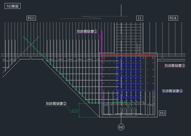 鉄筋工事の精度を高めるために、配筋納まり図の作成も手掛けています。建築設計図をもとに、鉄筋の配置や組み方を分かりやすく図面化することで、施工現場でのミスを防ぎ、スムーズな工事進行を実現します。確かな技術力を活かし、精密で分かりやすい配筋納まり図を提供します。